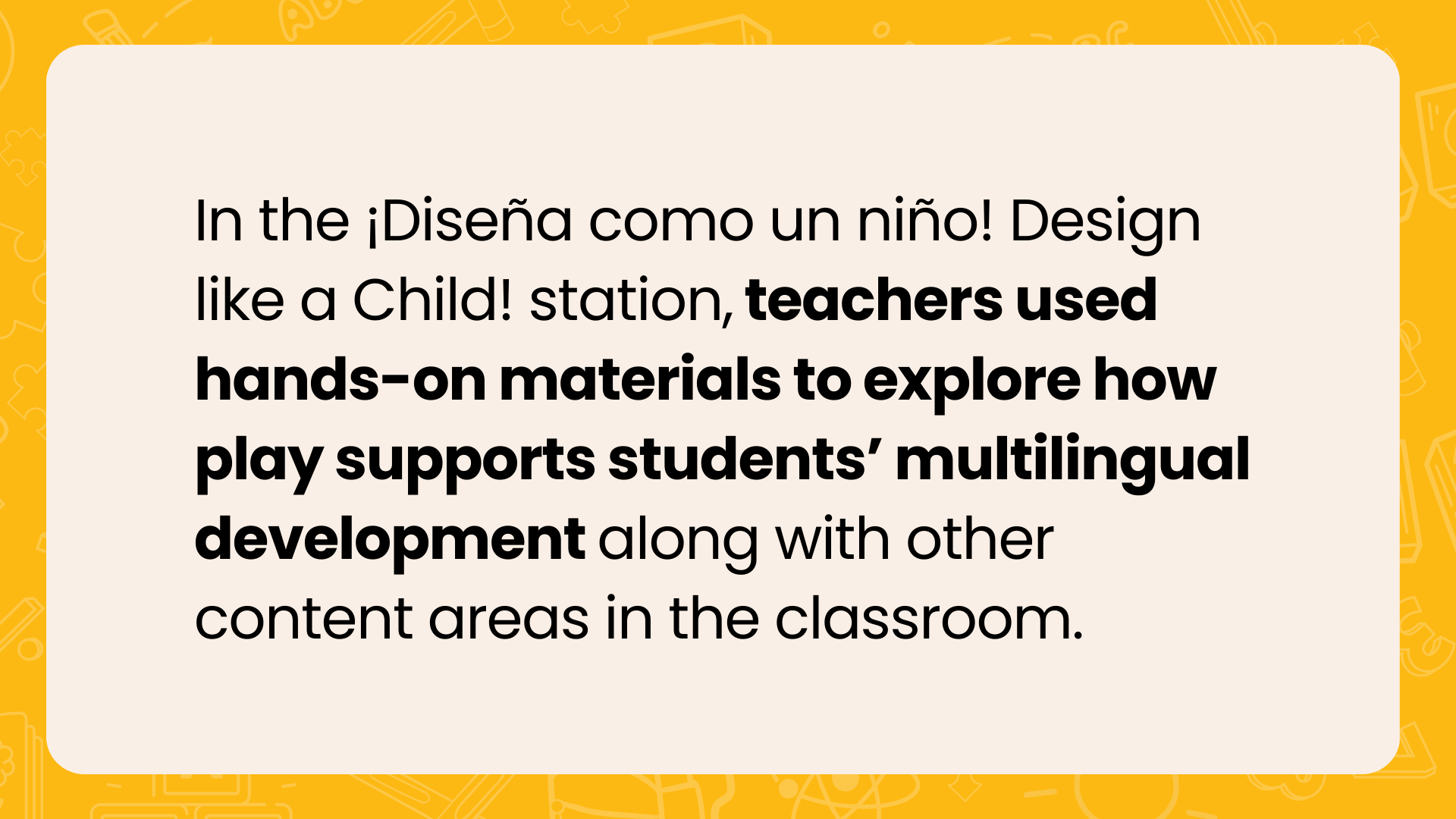 Building on this, Julio guided participants through multiple Language Lab stations to leverage their expertise while exploring design strategies that foster language-rich environments supportive of multilingual students. These focused on three core practices: translanguaging, biliteracy, and bilingual playful inquiry.