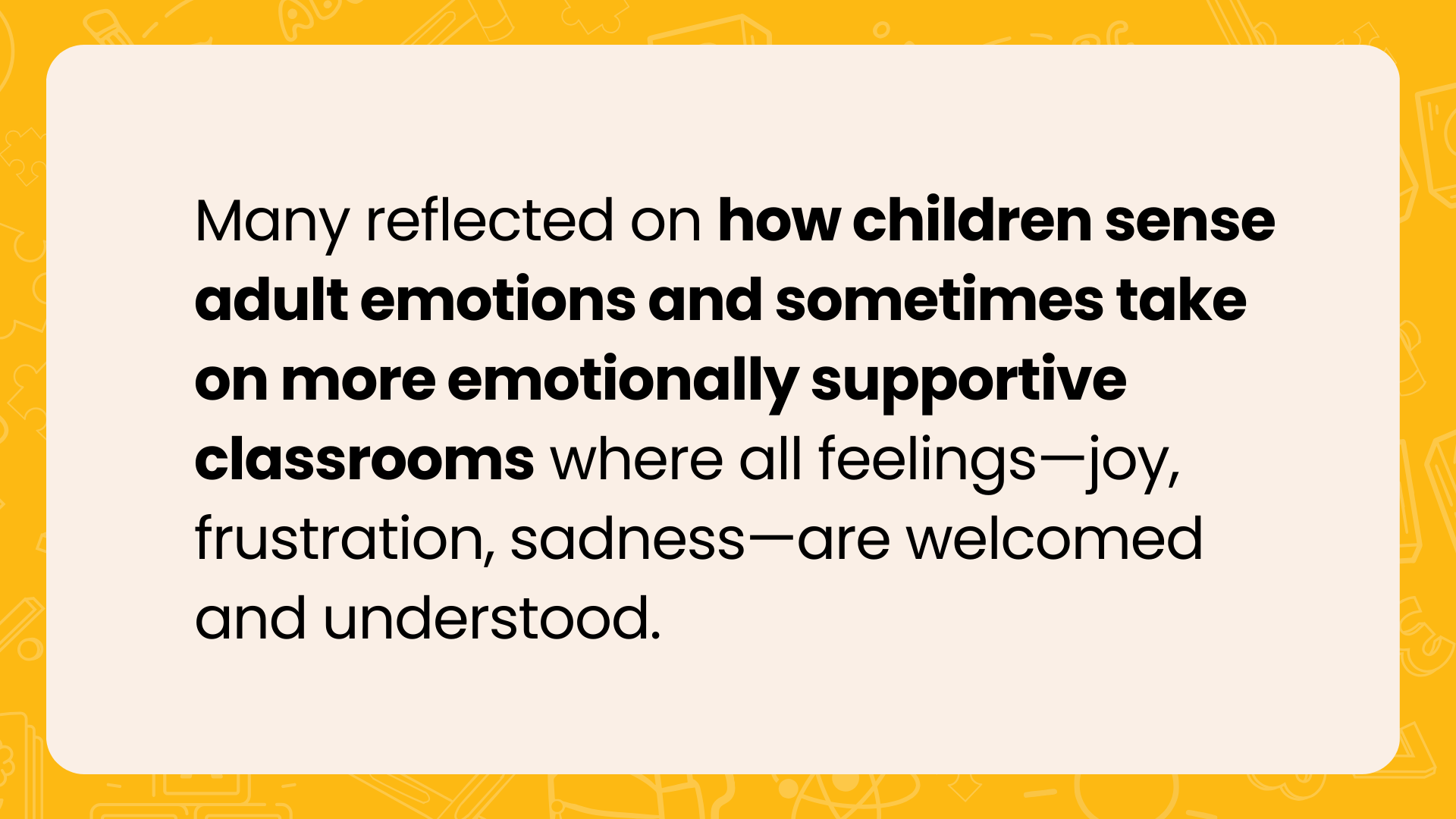 For many teachers in the room, this means pushing themselves: teaching full days in different languages, improving their own language proficiency, and overcoming fear. That courage led to many breakthroughs. Teachers described feeling more confident, better serving their multilingual learner students, and being proud of improving their teaching practices. Sometimes, impact comes from simple shifts, like incorporating music that let’s children sing and dance together, introducing new languages, having fun moving their bodies, and encouraging them to sing along to the words even when they don’t know the language yet.